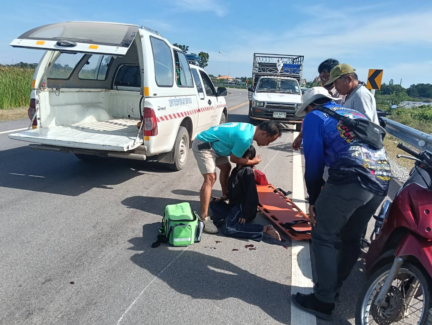 รับแจ้งจากศูนย์สั่งการ 1669 มีอุบัติเหตุรถมอเตอร์ไซค์ล้มเองบนถนนทางหลวงชนบท ชย.3049 บริเวณข้างทะเลสีดอ บ้านหัวทะเล ม.1