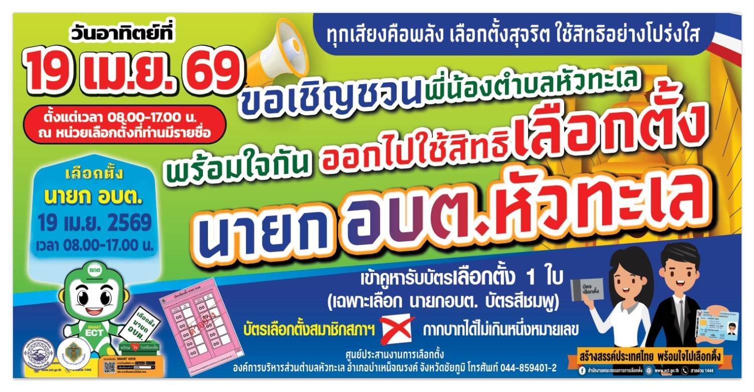 ขอเชิญชวนพี่น้องชาวตำบลหัวทะเล พร้อมใจกัน ออกไปใช้สิทธิเลือกตั้งนายกองค์การบริหารส่วนตำบลหัวทะเล วันอาทิตย์ที่ 19 เมษายน 2569 เวลา 08.00 - 17.00 น. |